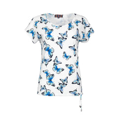 Butterfly shirt biedt een heerlijke relaxed fit met een charmante vlinderprint. Dit model met korte mouwen straalt in zachte tinten roze en zwart op een crèmekleurige basis. Gemaakt van een luchtige stof, zorgt het shirt voor zowel comfort als stijl. De subtiele ronde hals en de lichte gathers aan de zijkant geven het kledingstuk een unieke touch.