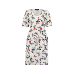 Deze jurk combineert comfort met stijl dankzij de relaxed fit. Het mooie vlinderpatroon in frisse blauw- en groentinten komt perfect tot zijn recht op de lichte achtergrond, waardoor het een echte blikvanger is. Vervaardigd uit een zachte stof, biedt deze jurk een fijne pasvorm en bewegingsvrijheid. Het praktische strikdetail in de taille zorgt voor een subtiele, flatterende afwerking.
